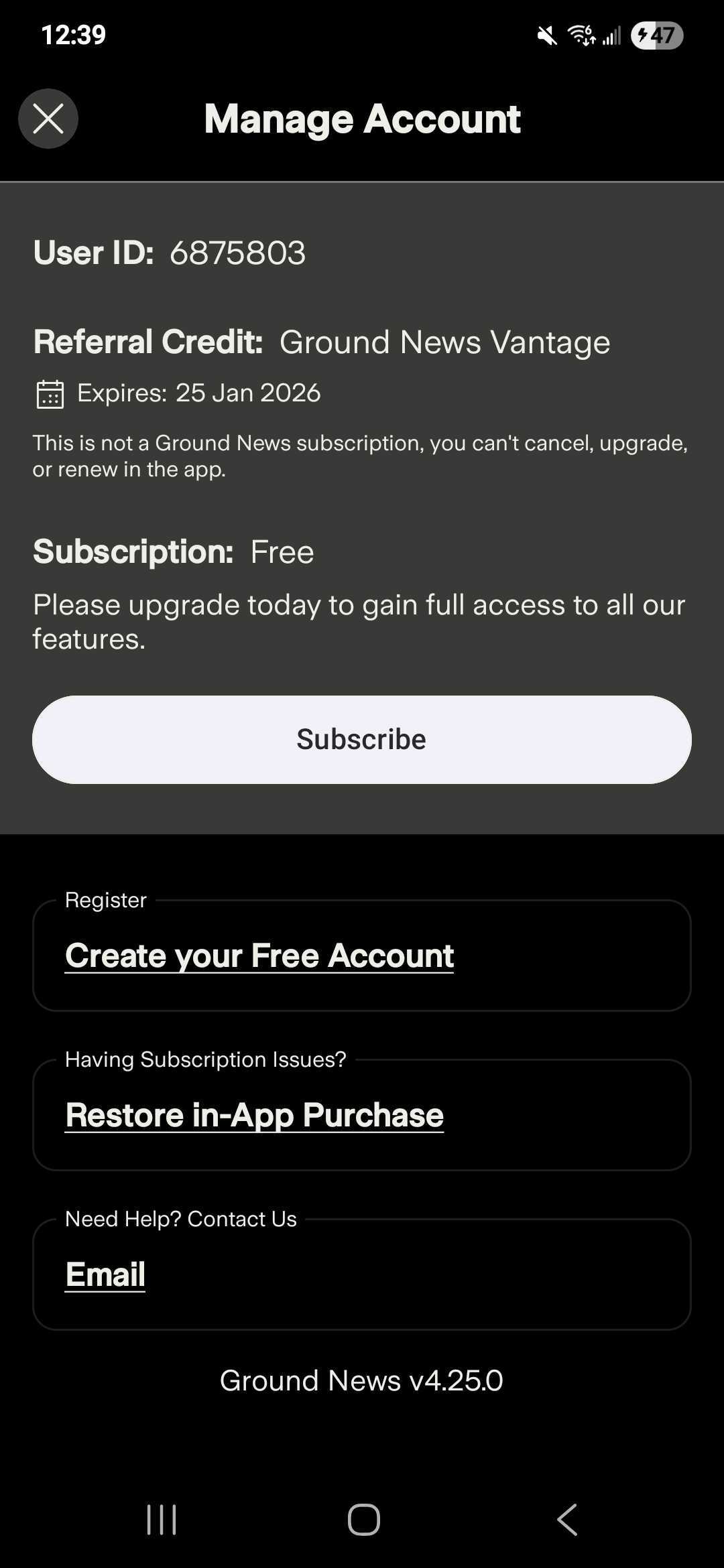 If you continue to experience trouble recognizing your subscription, please reach out to our team at subscriptions@ground.news and we would be happy to help.