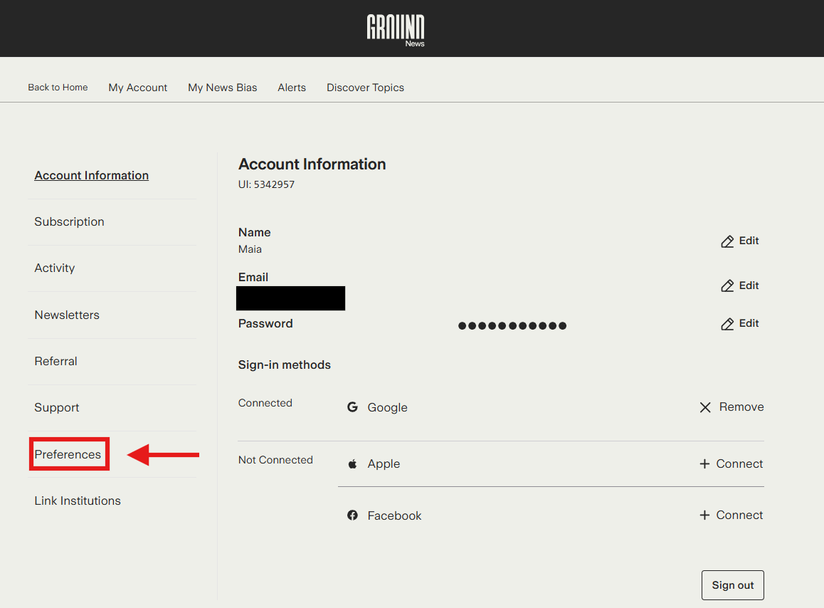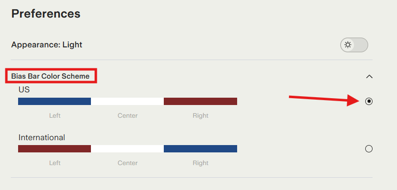 If you'd like to change the color scheme of the bias bar without having to change the Ground News edition, you can set up your Account Preferences to the US or International color scheme. To set this up on the website: