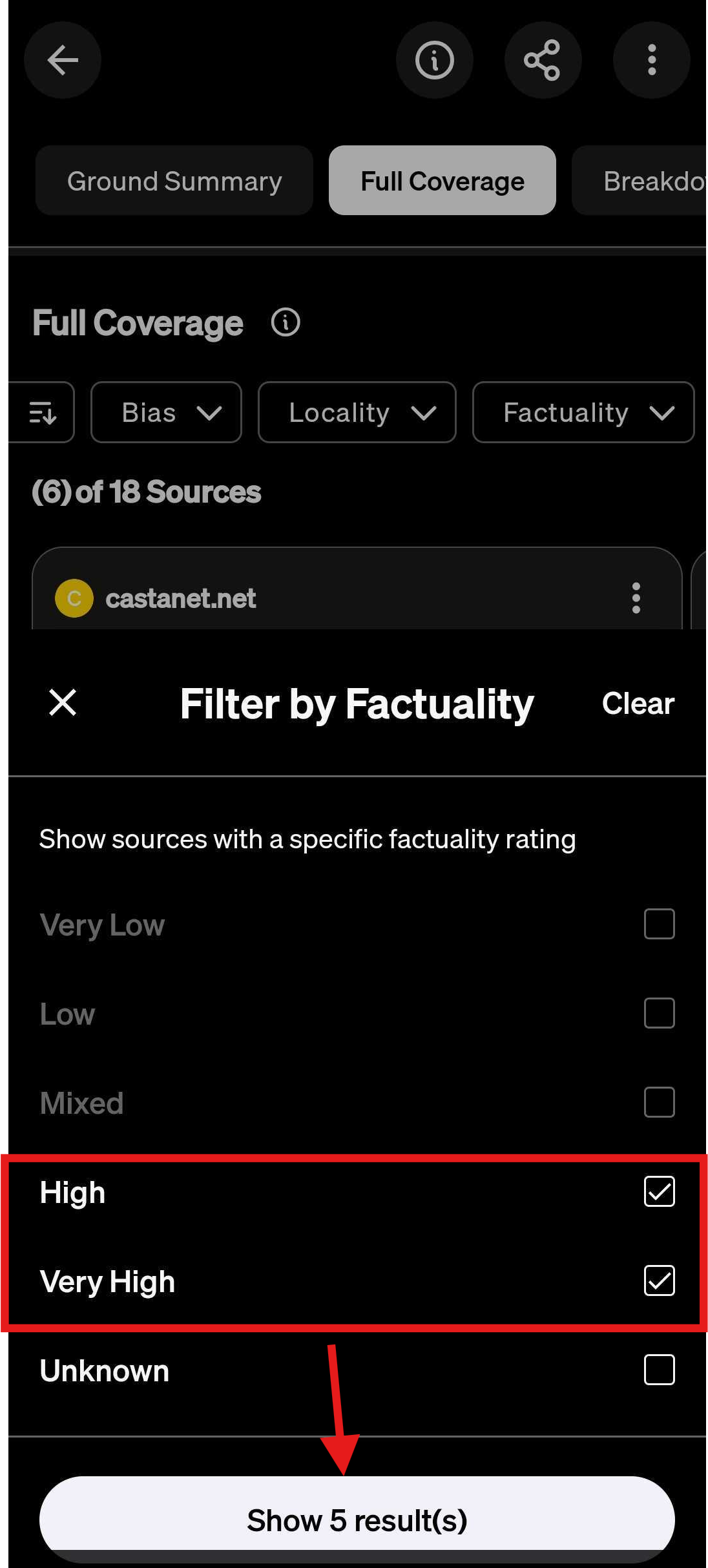 If you're looking for High or Very High Factuality sources, adjust the factuality filter settings accordingly. Then, tap Show Results at the bottom of the screen.
