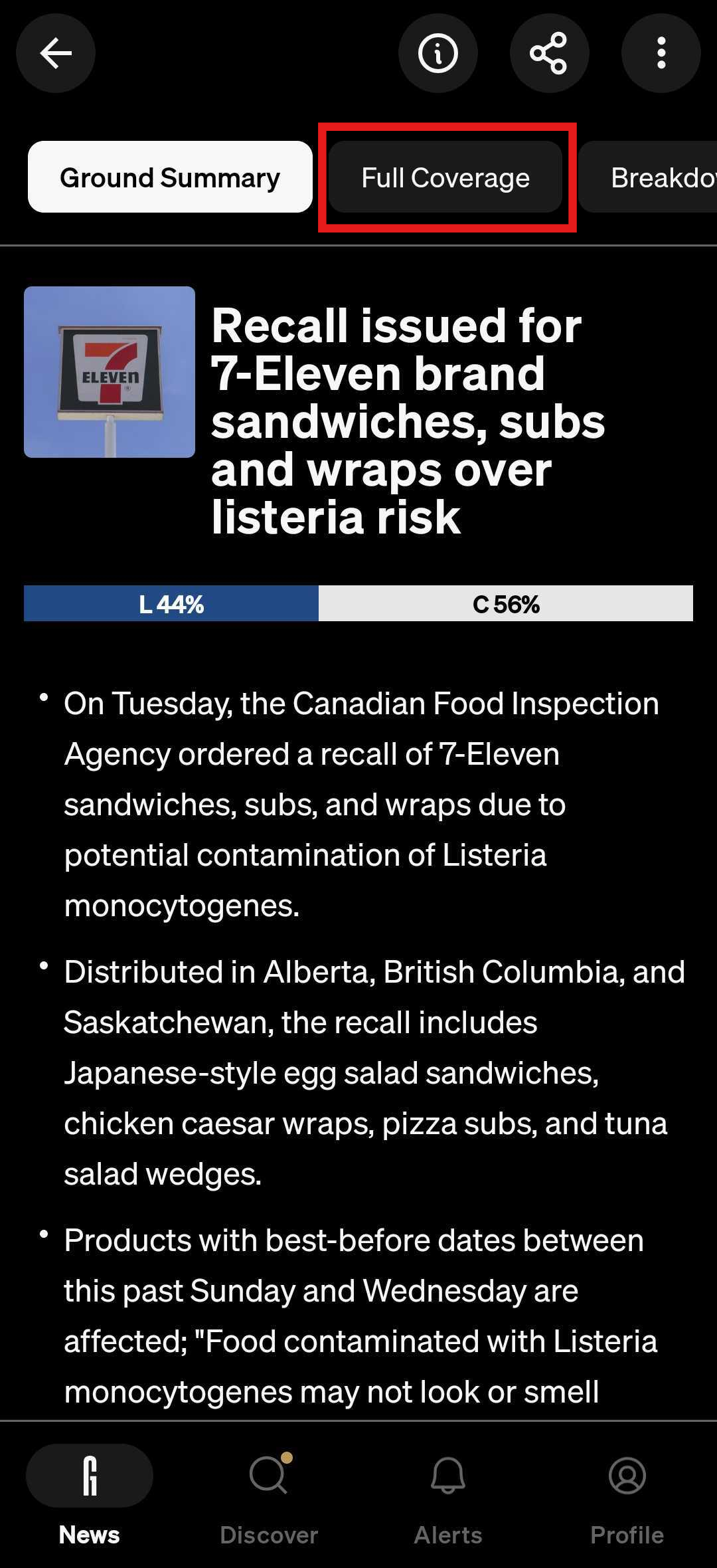 Scroll to the Full Coverage carousel (where different sources covering the same story are displayed) OR Select the Full Coverage tab at the top of the story page