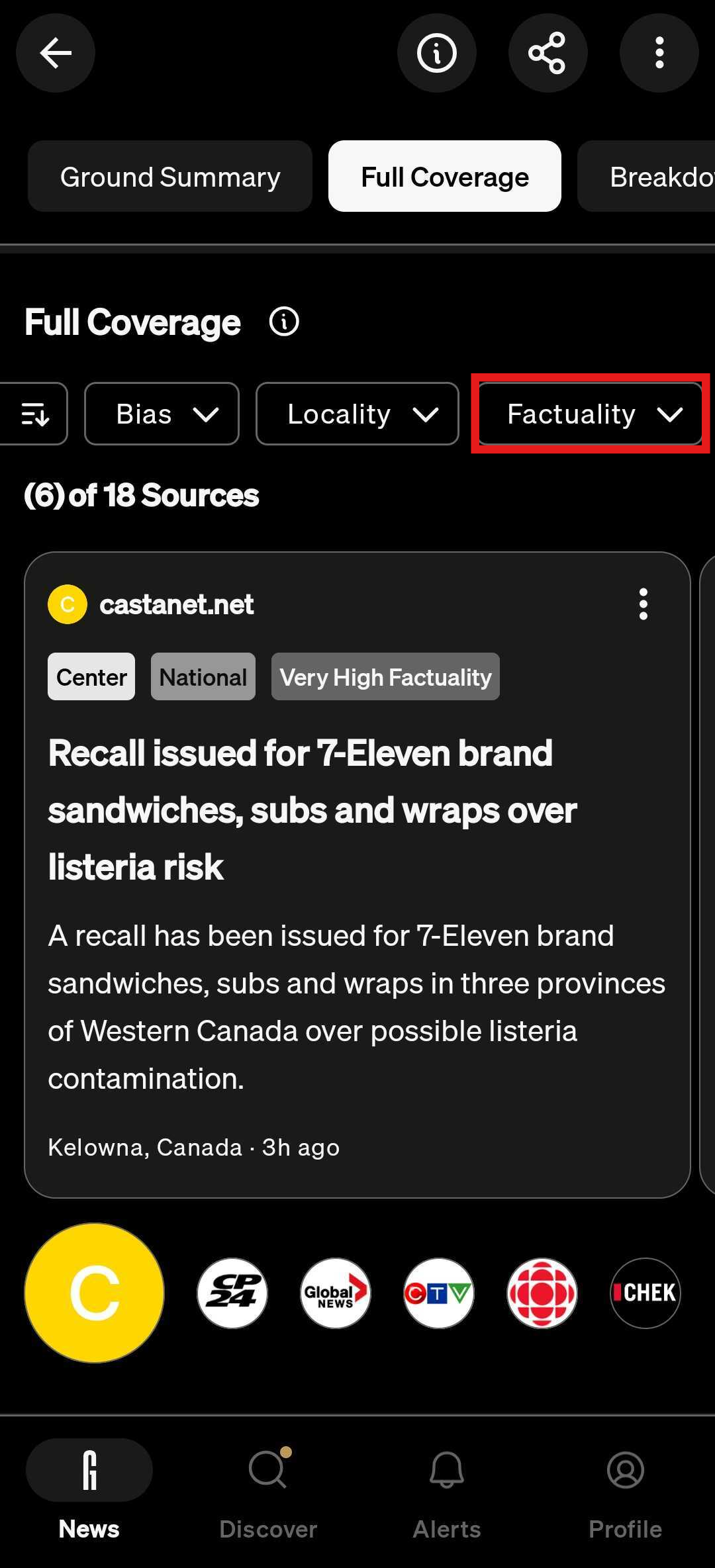 Under the Full Coverage section, scroll to the left until you see the Factuality tab, then tap on the tab
